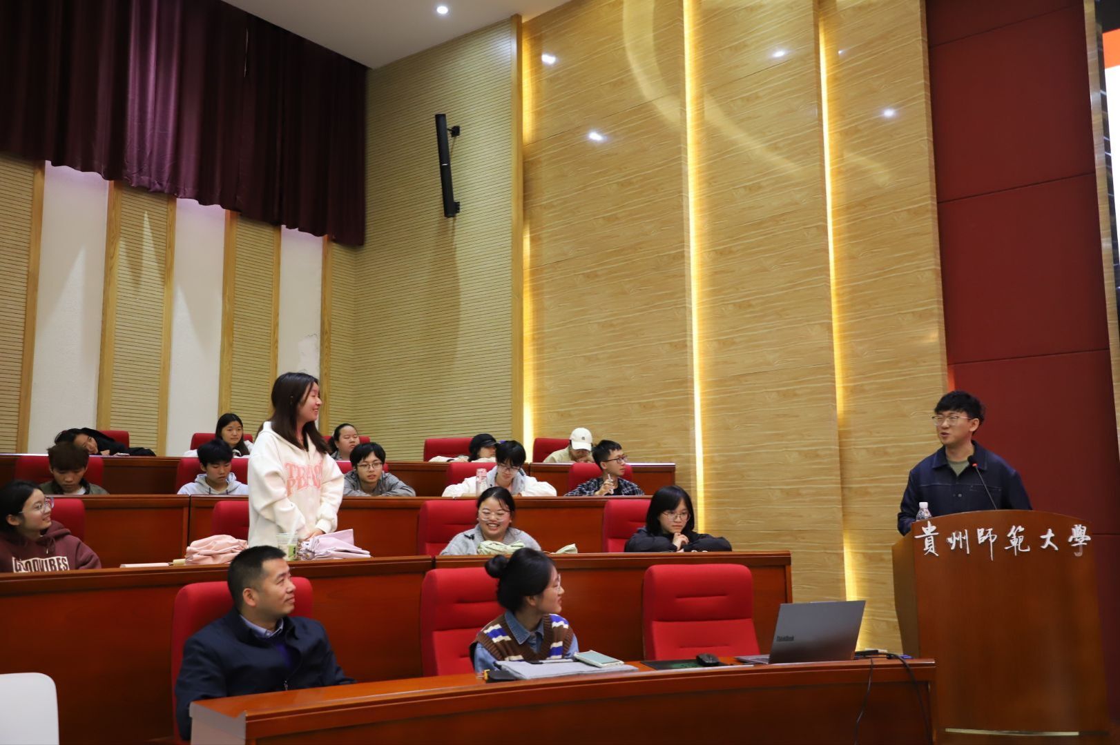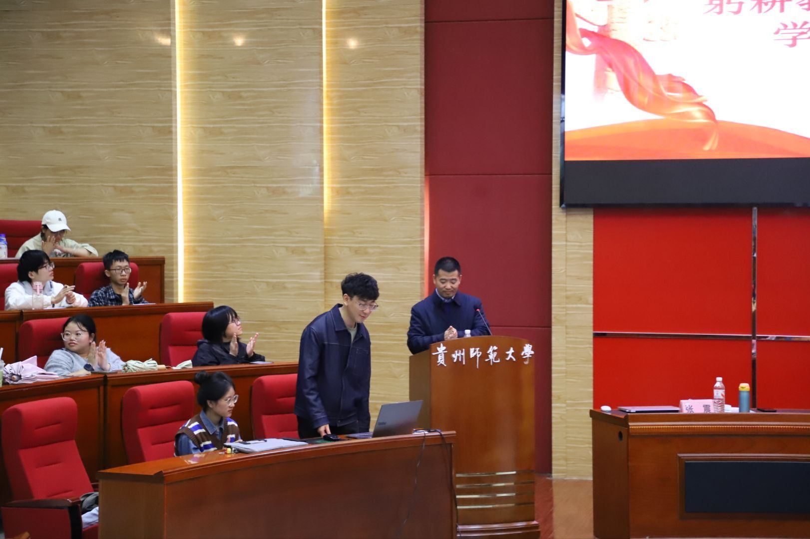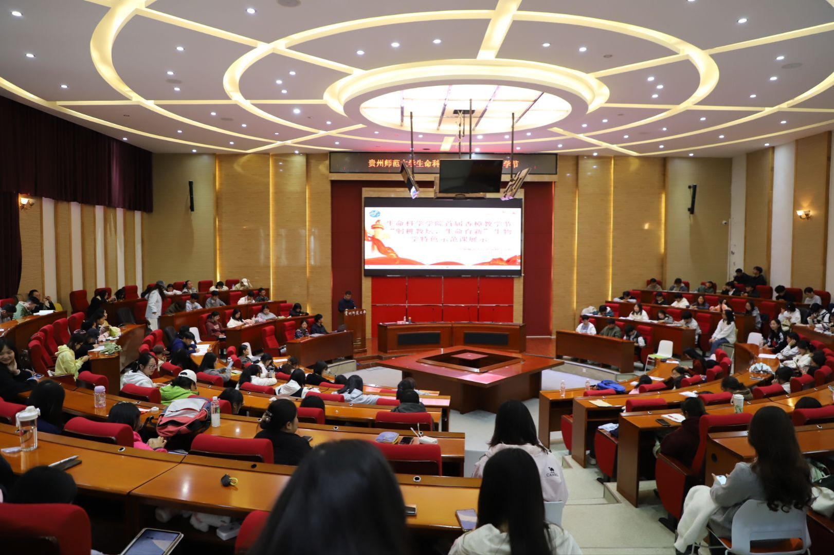 为传承校园香樟文化精神,厚植立德树人教育理念,涵养师生人文与科学交融情怀,2025年10月21日下午,生命科学学院首届香樟教学节 “躬耕教坛,生命育新”生物学特色示范课展示第四场活动在公教6101举行。本次活动以“深化生物学科核心素养培育”为核心,通过特色示范课展示与课程设计深度研讨,搭建起师生教学能力共建的优质平台,助力师范生教学实践能力与教师教学创新能力双向提升。展示课由生命科学学院副院长彭涛担任主持,特邀贵阳市观山湖区普瑞学校张震老师主讲,23级、24级全体师范生参与。